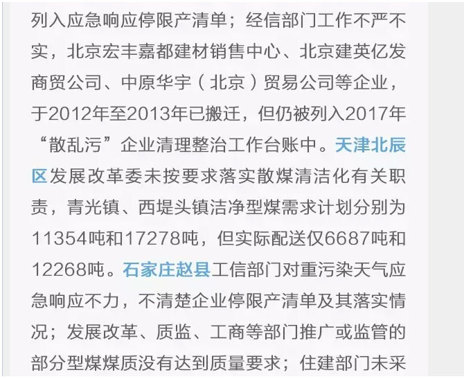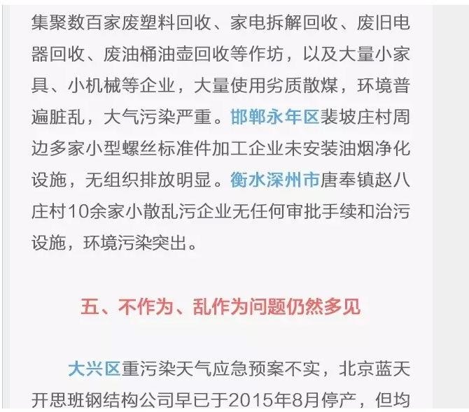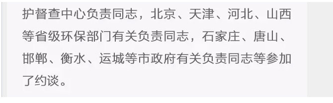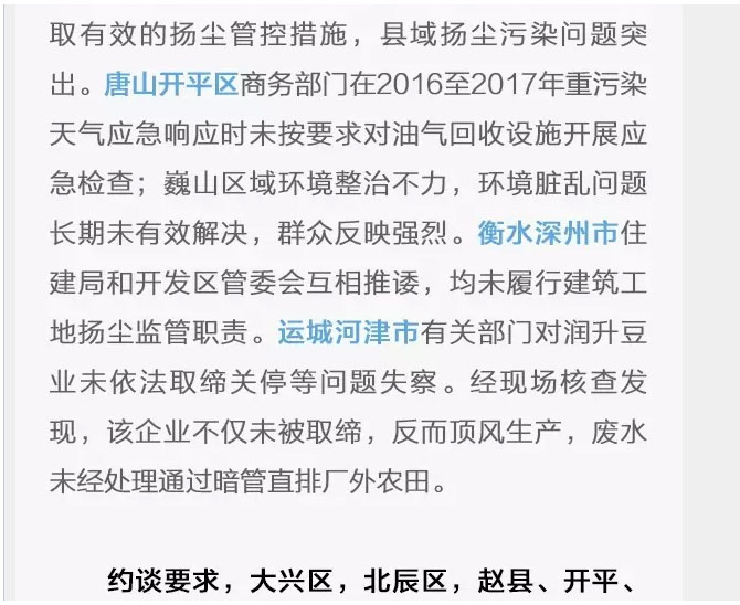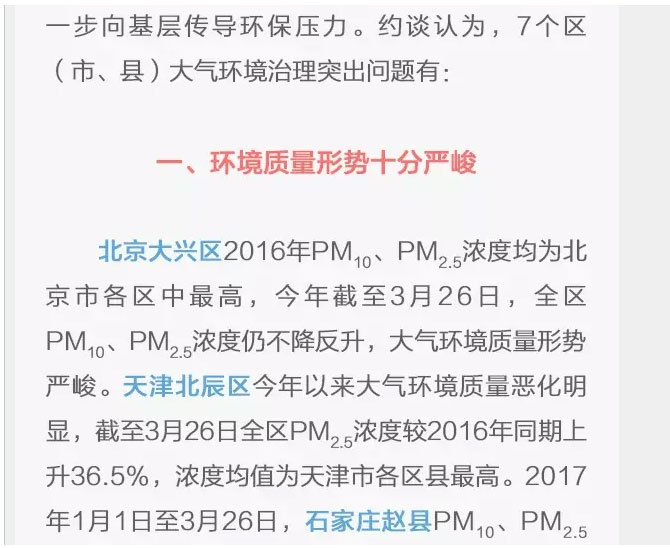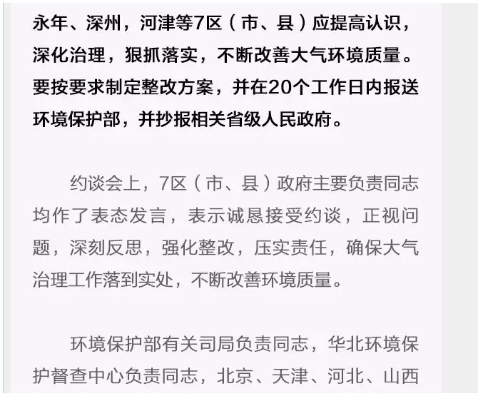 2017年4月1日,环境保护部对北京市大兴区,天津市北辰区,河北省石家庄赵县、唐山开平区、邯郸永年区、衡水深州市,山西省运城河津市政府主要负责同志进行集中约谈,督促落实大气污染治理措施,夯实环境保护主体责任,进一步向基层传导环保压力。
