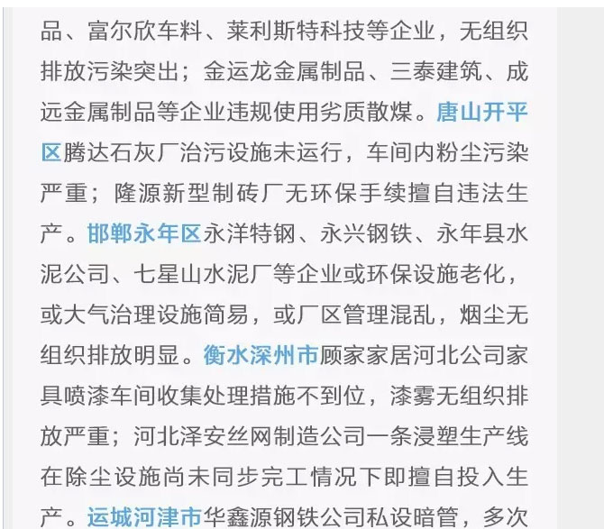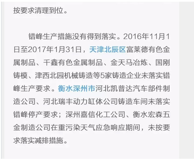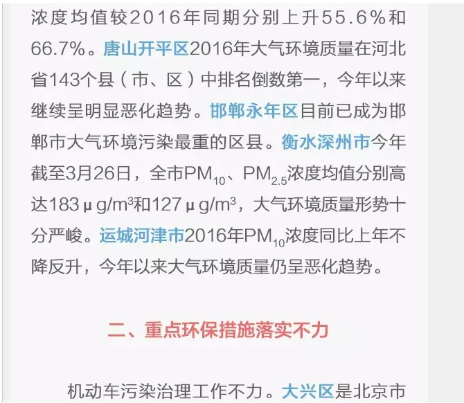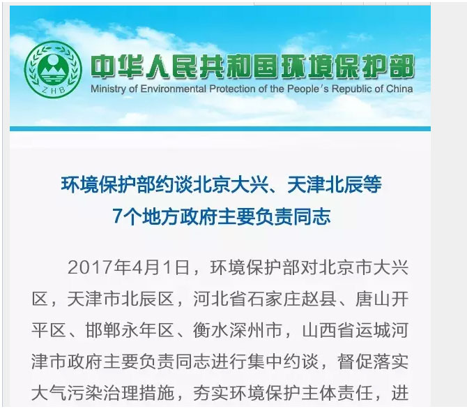 2017年4月1日,环境保护部对北京市大兴区,天津市北辰区,河北省石家庄赵县、唐山开平区、邯郸永年区、衡水深州市,山西省运城河津市政府主要负责同志进行集中约谈,督促落实大气污染治理措施,夯实环境保护主体责任,进一步向基层传导环保压力。