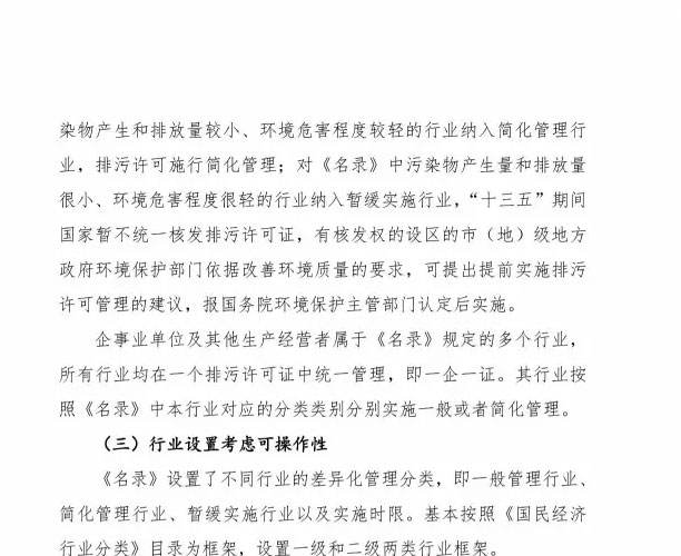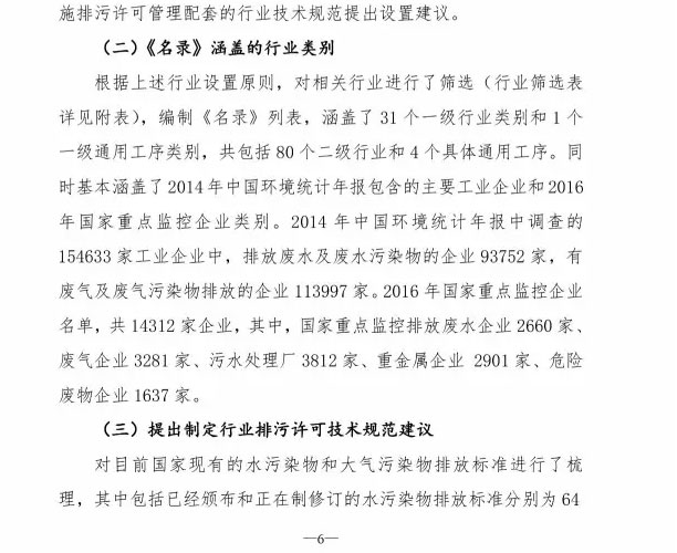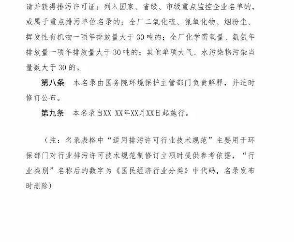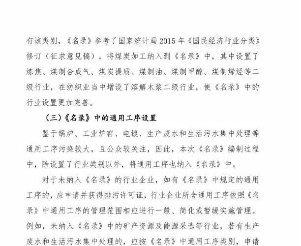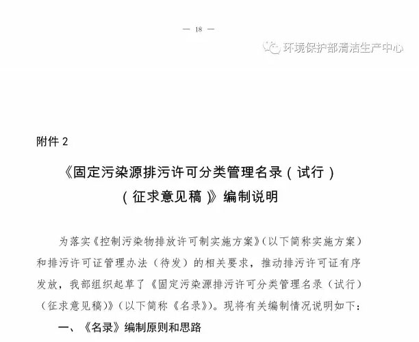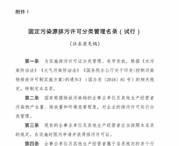 为落实《控制污染物排放许可制实施方案》,加快建立和完善覆盖所有固定污染源的企事业单位控制污染物排放许可制,我部研究制定了《固定污染源排污许可分类管理名录(试行)(征求意见稿)》。